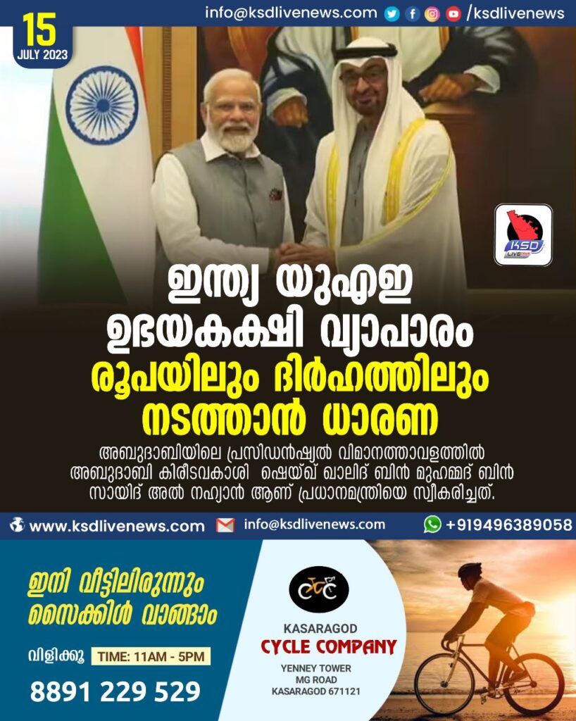 ഇന്ത്യ യുഎഇ ഉഭയകക്ഷി വ്യാപാരം രൂപയിലും ദിർഹത്തിലും നടത്താൻ ധാരണ