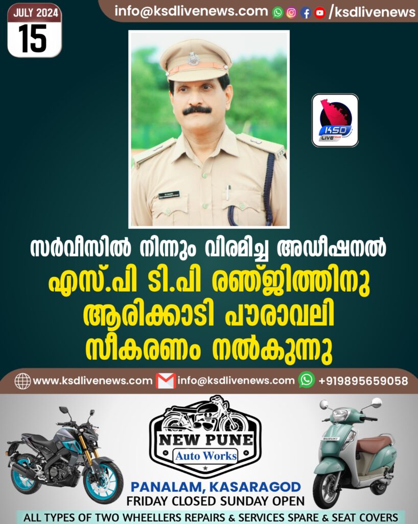 കുമ്പള: നിയമ പാലന രംഗത്ത് അഭിമാനർഹമായ സേവനം നടത്തി തെളിയിക്കപ്പെടാൻ പ്രയാസമായിരുന്ന നിരവധി പ്രമാദമായ കേസുകൾക്ക് തുമ്പുണ്ടാക്കി സർവീസിൽ നിന്നും വിരമിച്ച അഡീഷണൽ എസ് പി, ശ്രീ “ടി പി രഞ്ജിത്തിനെ” ആരിക്കാടി പൗരാവലി 2024 ആഗസ്റ്റ് അവസാന വാരം കെ പി റിസോർട്ടിൽ വെച്ച് ആദരിക്കുന്നു.