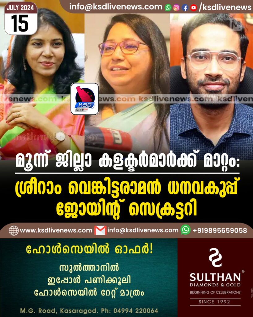 മൂന്ന് ജില്ലാ കളക്ടർമാർക്ക് മാറ്റം; ശ്രീറാം വെങ്കിട്ടരാമൻ ധനവകുപ്പ് ജോയിന്റ് സെക്രട്ടറി