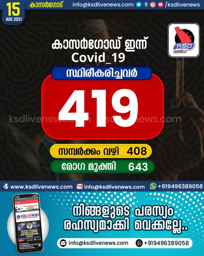 കാസർഗോഡ് ജില്ലയിൽ ഇന്ന് 419 പേർക്ക് കോവിഡ് സ്ഥിരീകരിച്ചു. സമ്പർക്കം വഴി 408 പേർക്കും. 643 പേർക്ക് രോഗമുക്തി