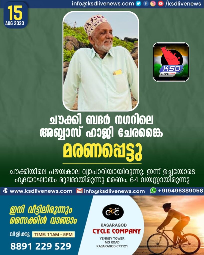 ചൗക്കി / ബദർ നഗർ : ചേരങ്കൈ സ്വദേശിയും ചൗക്കി ബദർ നഗറിൽ താമസവുമുള്ള അബ്ബാസ് ഹാജി 64 മരണപ്പെട്ടു; ഇന്ന് ഉച്ചയോടെ ഹൃദയാഘാതം മൂലം ആയിരുന്നു മരണം സംഭവിച്ചത്…ചൗക്കിയിലെ പഴയകാല വ്യാപാരിയായിരുന്നു.