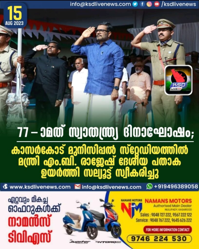 77-ാമത് സ്വാതന്ത്ര്യ ദിനാഘോഷം; കാസര്കോട് മുനിസിപ്പല് സ്റ്റേഡിയത്തില് മന്ത്രി എം.ബി.രാജേഷ് ദേശീയ പതാക ഉയര്ത്തി സല്യൂട്ട് സ്വീകരിച്ചു