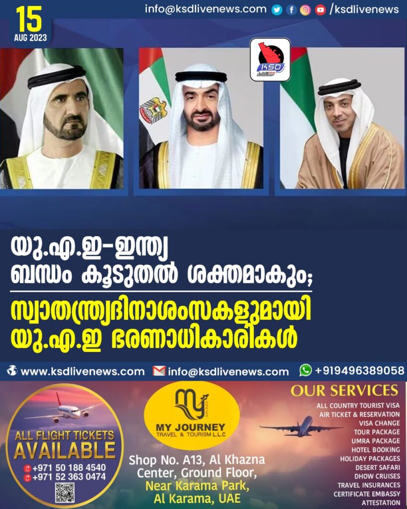 യുഎഇ–ഇന്ത്യ ബന്ധം കൂടുതൽ ശക്തമാകും; സ്വാതന്ത്ര്യദിനാശംസകളുമായി യുഎഇ ഭരണാധികാരികൾ…