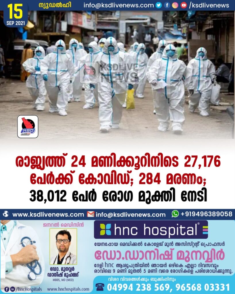 രാജ്യത്ത് 24 മണിക്കൂറിനിടെ 27,176 പേർക്ക് കോവിഡ്; 284 മരണം ; 38,012 പേർ രോഗ മുക്തി നേടി