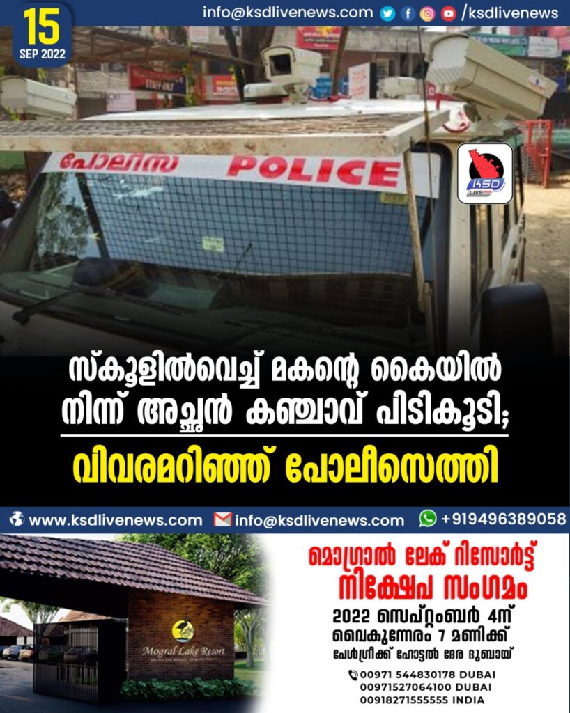 സ്കൂളില്വെച്ച് മകന്റെ കൈയില്നിന്ന് അച്ഛന് കഞ്ചാവ് പിടികൂടി; വിവരമറിഞ്ഞ് പോലീസെത്തി