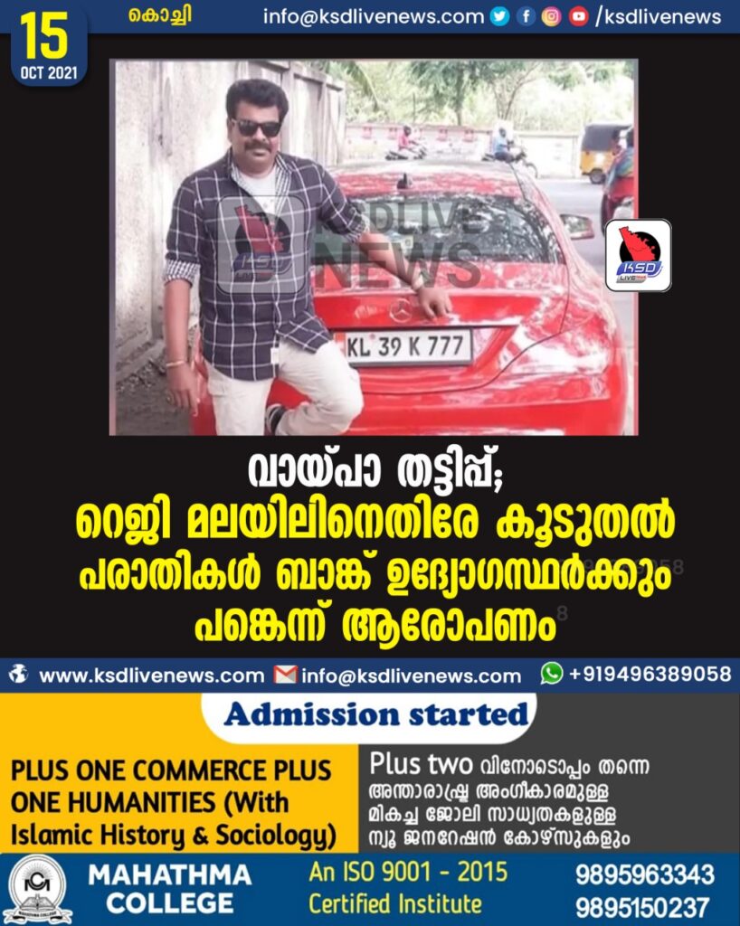 വായ്പാ തട്ടിപ്പ്: റെജി മലയിലിനെതിരേ കൂടുതല്‍ പരാതികള്‍, ബാങ്ക് ഉദ്യോഗസ്ഥര്‍ക്കും പങ്കെന്ന് ആരോപണം