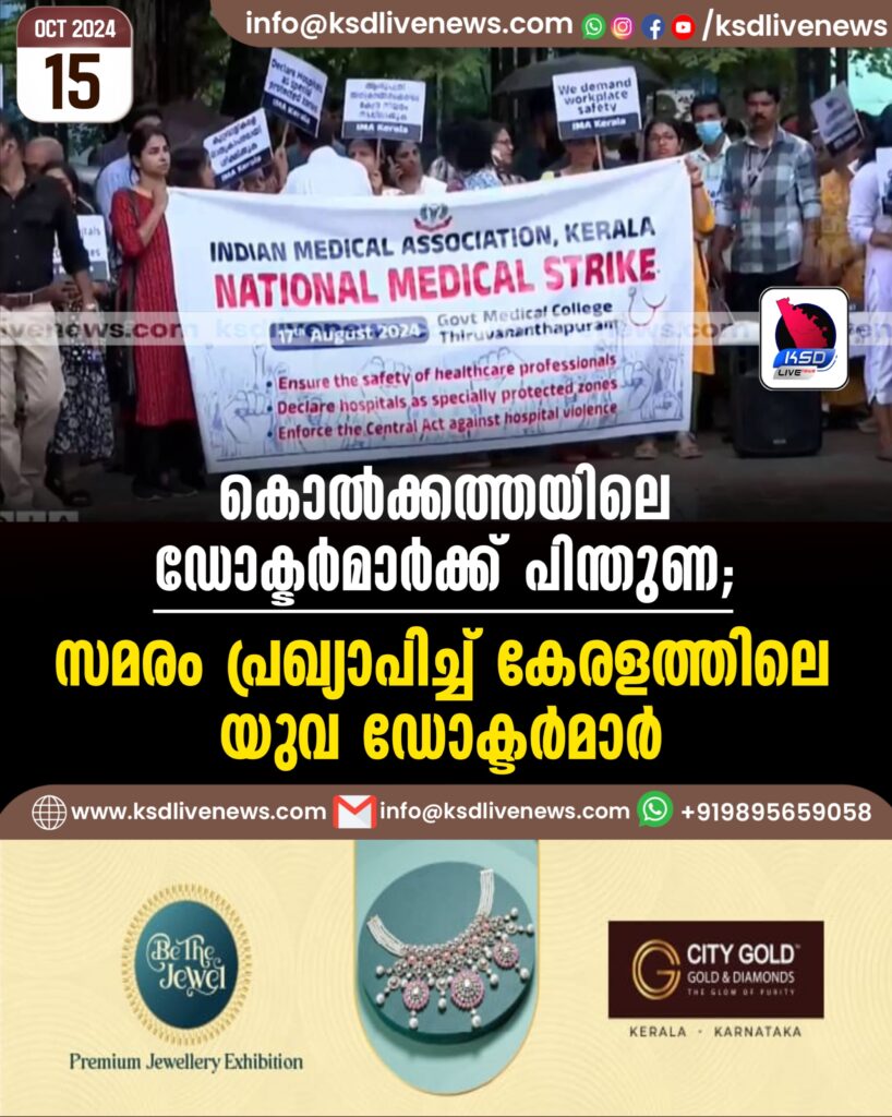 തിരുവനന്തപുരം: കൊല്‍ക്കത്തയിലെ ആർജി കർ മെഡിക്കല്‍ കോളജില്‍ നിരാഹാര സത്യാഗ്രഹം നടത്തുന്ന യുവ ഡോക്ടർമാർക്ക് പിന്തുണ പ്രഖ്യാപിച്ച്‌ കേരളത്തിലെ യുവ ഡോക്ടർമാർ.