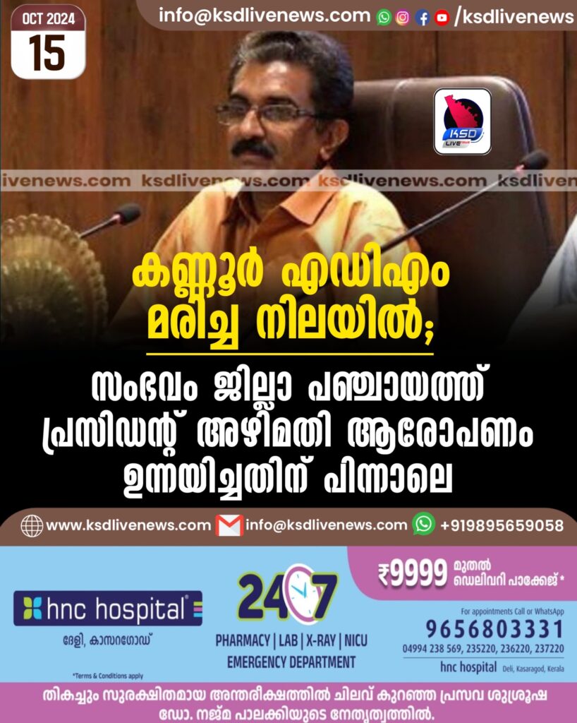കണ്ണൂർ എഡിഎം മരിച്ച നിലയിൽ; സംഭവം ജില്ലാ പഞ്ചായത്ത് പ്രസിഡന്റ് അഴിമതി ആരോപണം ഉന്നയിച്ചതിന് പിന്നാലെ
