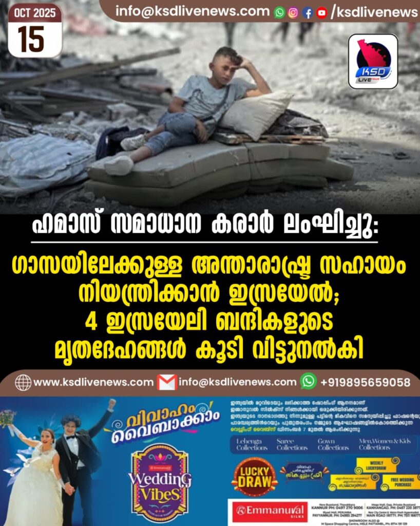 ഹമാസ് സമാധാന കരാർ ലംഘിച്ചു: ഗാസയിലേക്കുള്ള അന്താരാഷ്ട്ര സഹായം നിയന്ത്രിക്കാൻ ഇസ്രയേല്; 4 ഇസ്രയേലി ബന്ദികളുടെ മൃതദേഹങ്ങൾ കൂടി വിട്ടുനൽകി