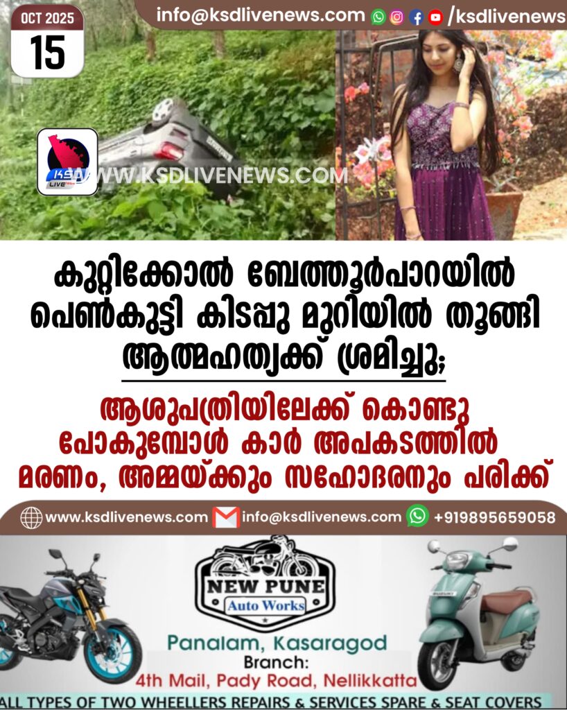 കുറ്റിക്കോൽ ബേത്തൂർപാറയിൽ പെൺകുട്ടി കിടപ്പു മുറിയിൽ തൂങ്ങി ആത്മഹത്യക്ക് ശ്രമിച്ചു; ആശുപത്രിയിലേക്ക് കൊണ്ടുപോകുമ്പോൾ കാർ അപകടത്തിൽ മരണം, അമ്മയ്ക്കും സഹോദരനും പരിക്ക്