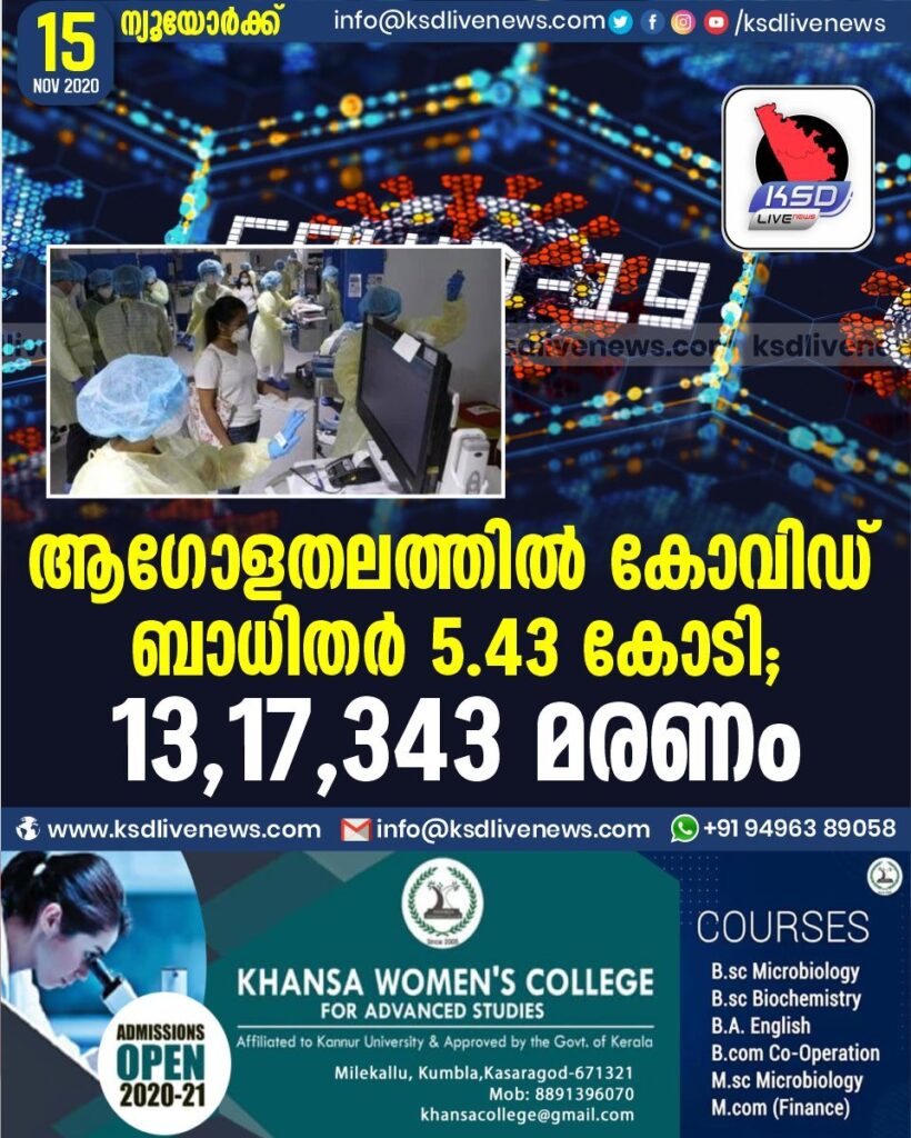 ആഗോളതലത്തിൽ കോവിഡ് ബാധിതർ 5.43 കോടി ; 13,17,343 മരണം