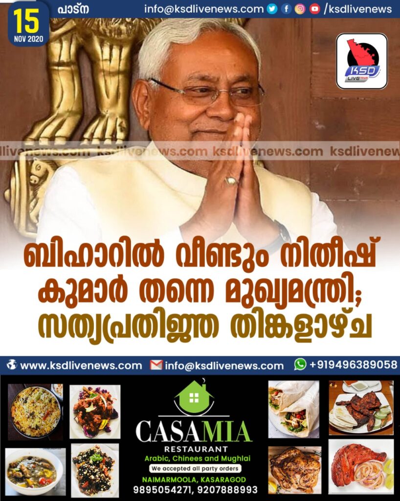 ബിഹാറില് വീണ്ടും നിതീഷ് കുമാര് തന്നെ മുഖ്യമന്ത്രി ; സത്യപ്രതിജ്ഞ തിങ്കളാഴ്ച