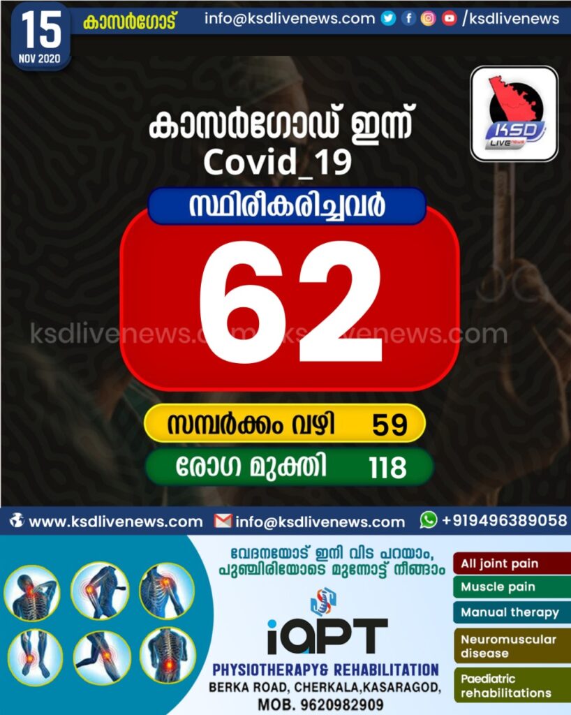 വാര്‍ത്താക്കുറിപ്പ് 15.11.2020 കാസര്‍കോട് ജില്ലയില്‍ 62 പേര്‍ക്ക് കോവിഡ്, 118 പേര്‍ക്ക് രോഗമുക്തി