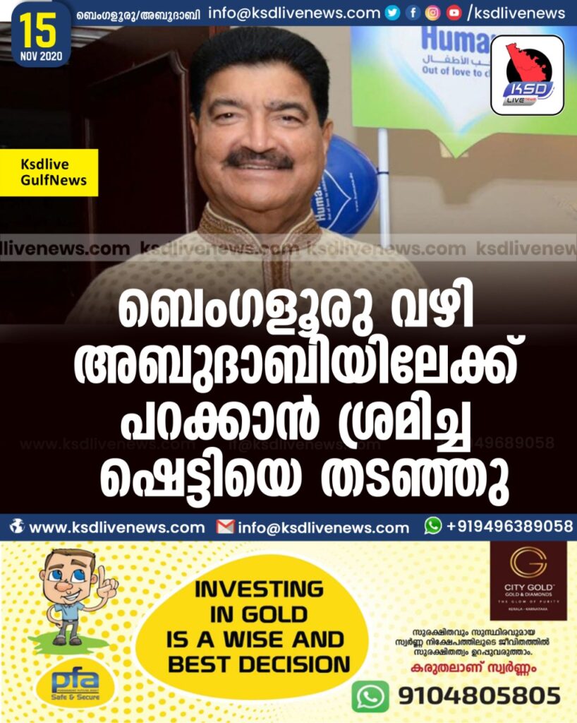 ബെംഗളൂരു വഴി അബുദാബിയിലേക്ക് പറക്കാൻ ശ്രമിച്ച ഷെട്ടിയെ തടഞ്ഞു