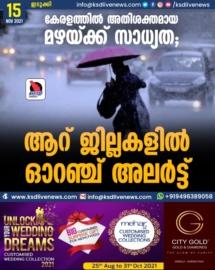 കേരളത്തിൽ അതിശക്തമായ മഴയ്ക്ക് സാധ്യത; ആറ് ജില്ലകളിൽ ഓറ‍‌ഞ്ച് അലർട്ട്