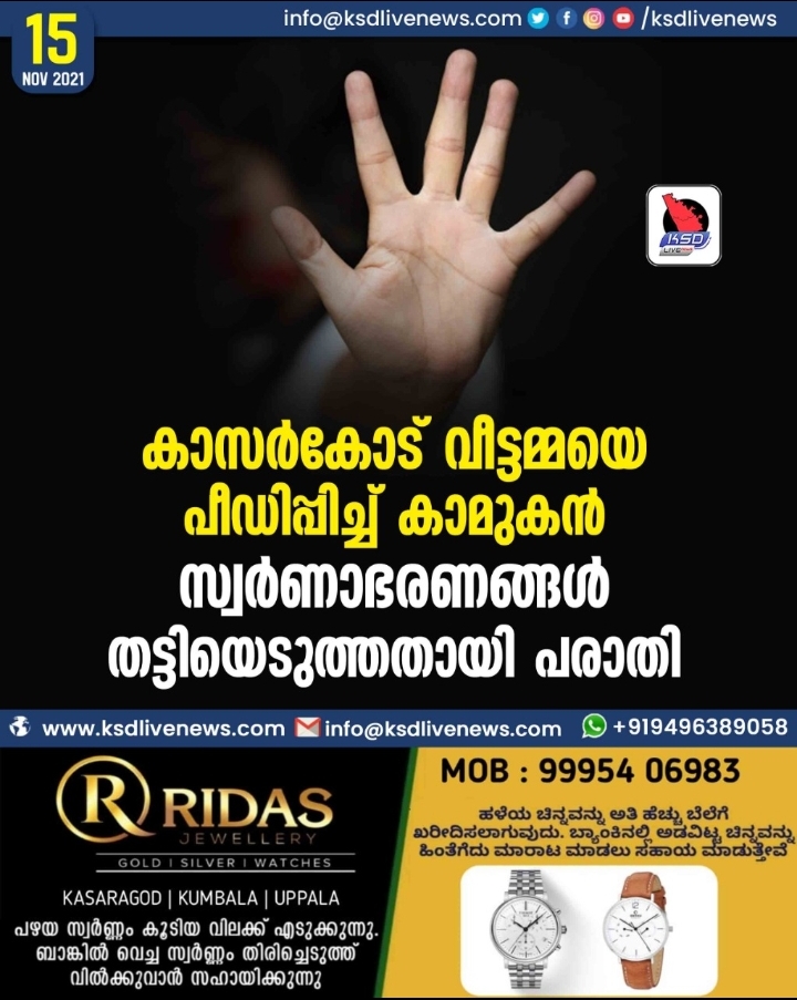 കാസര്കോട് വീട്ടമ്മയെ പീഡിപ്പിച്ച് കാമുകൻ സ്വർണാഭരണങ്ങൾ തട്ടിയെടുത്തതായി പരാതി
