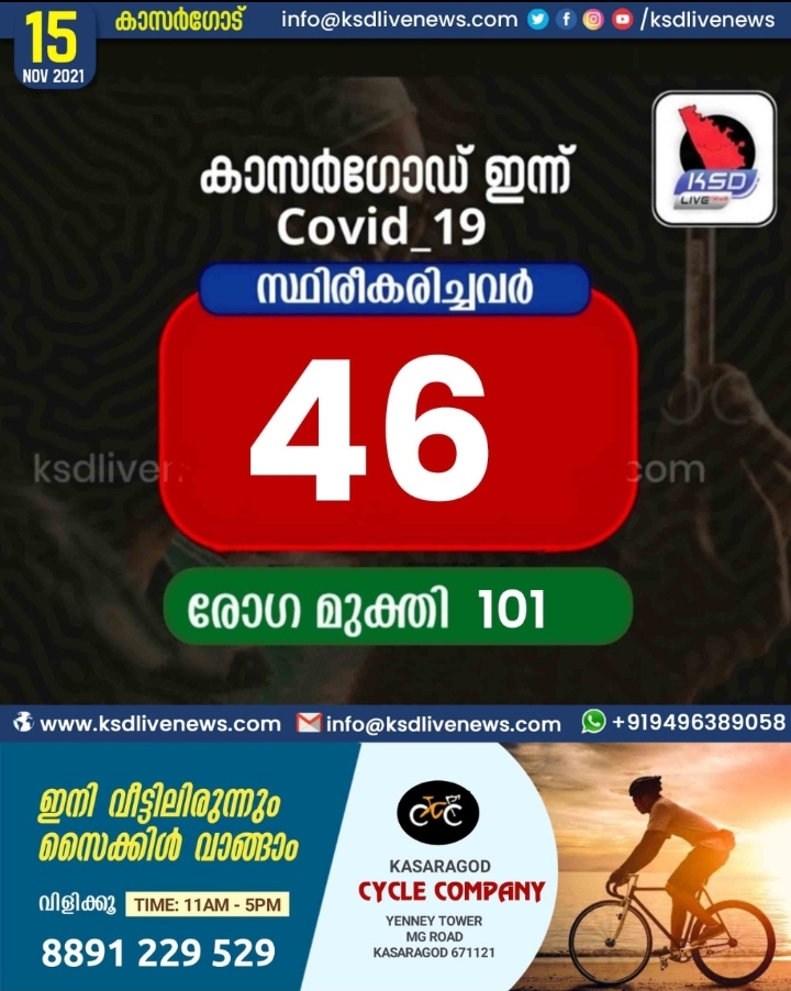 കോവിഡ് കുറയുന്നു; കാസർഗോഡ് ജില്ലയിൽ ഇന്ന് 46 പേർക്ക് കോവിഡ് സ്ഥിരീകരിച്ചു. 101 പേർക്ക് രോഗമുക്തിSHARE THIS ON