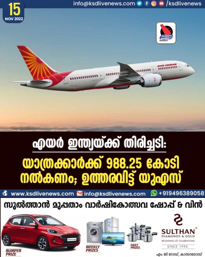 എയർ ഇന്ത്യയ്ക്ക് തിരിച്ചടി: യാത്രക്കാർക്ക് 988.25 കോടി നൽകണം; ഉത്തരവിട്ട് യുഎസ്
