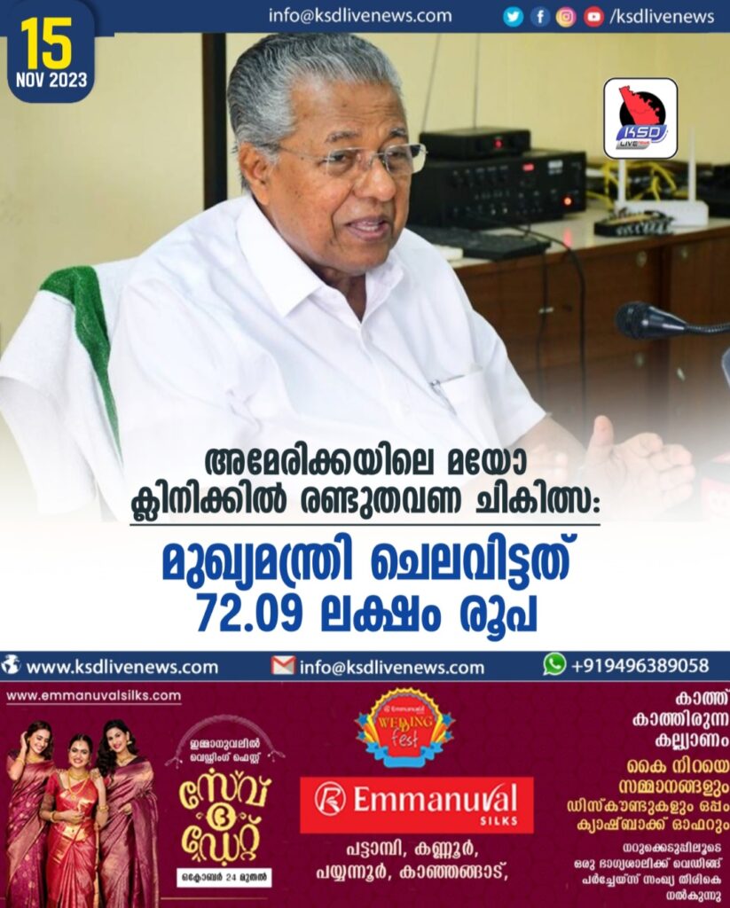 അമേരിക്കയിലെ മയോ ക്ലിനിക്കിൽ രണ്ടുതവണ ചികിത്സ: മുഖ്യമന്ത്രി ചെലവിട്ടത് 72.09 ലക്ഷം രൂപ