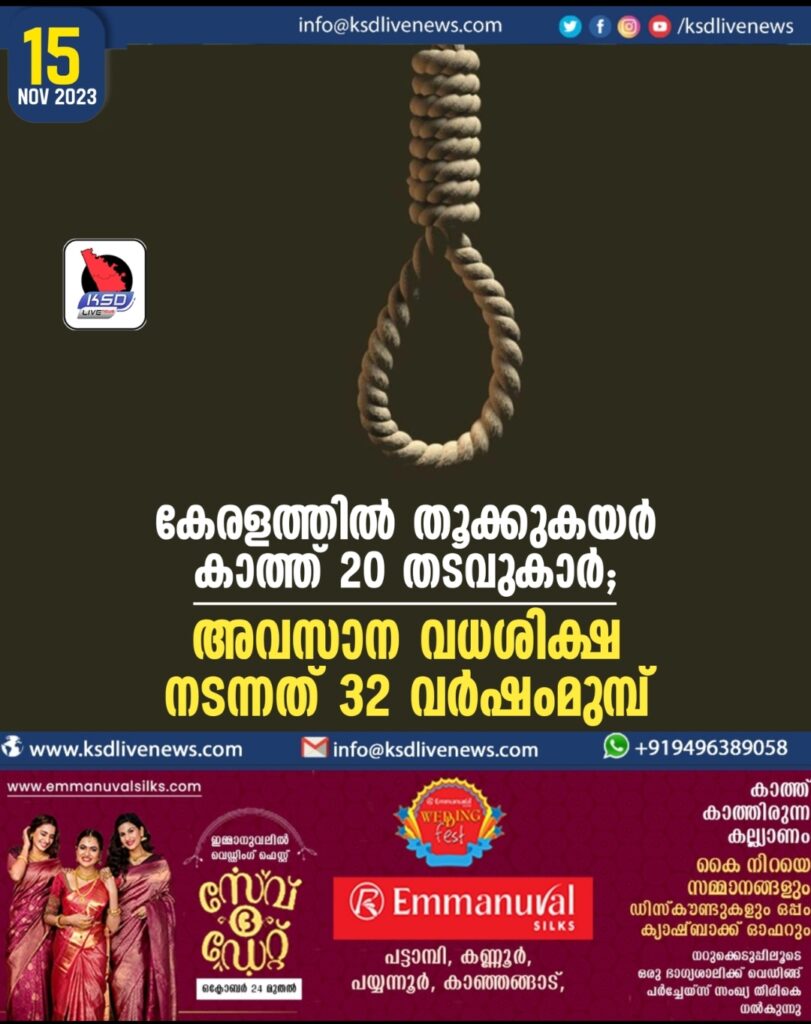 കേരളത്തിൽ തൂക്കുകയർ കാത്ത് 20 തടവുകാർ; അവസാന വധശിക്ഷ നടന്നത് 32 വർഷംമുമ്പ്
