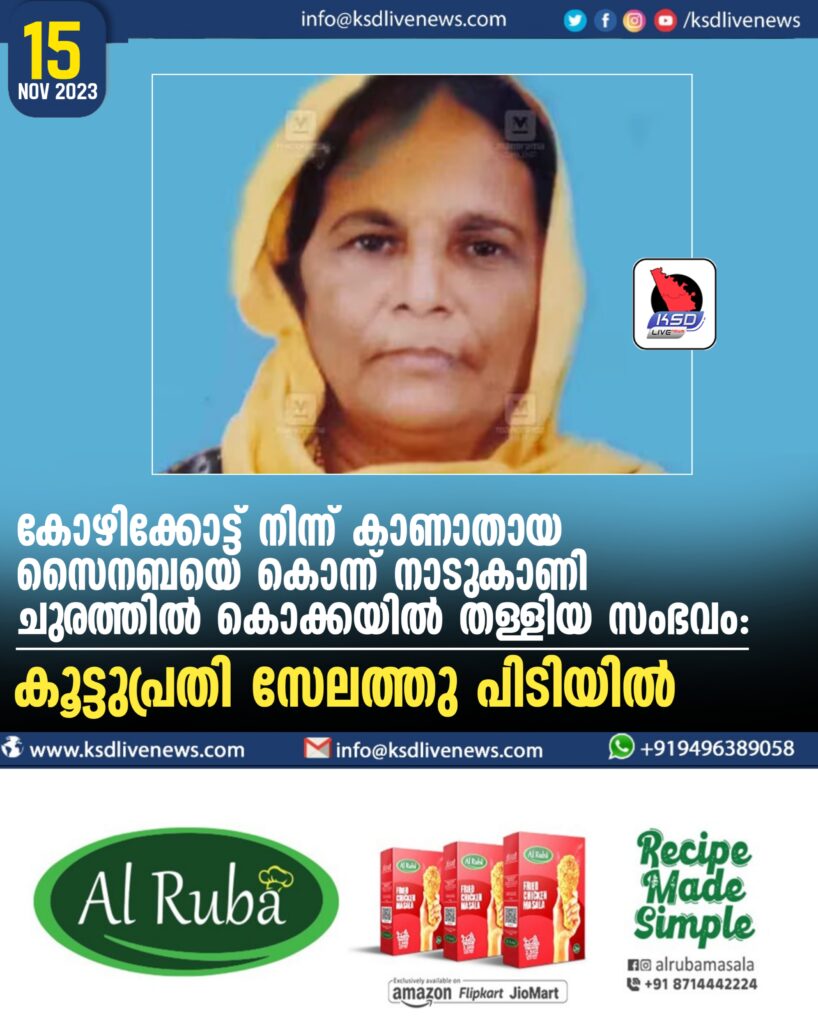 ഈ മാസം ഏഴിന് കോഴിക്കോട് പുതിയ ബസ് സ്റ്റാൻഡിൽ നിന്നാണ് സൈനബയെ കാണാതായത്. ഭര്ത്താവ് ജെയിംസ് പരാതി നൽകിയതിനെ തുടർന്ന് കസബ പൊലീസ് കേസ് റജിസ്റ്റർ ചെയ്ത് അന്വേഷണം നടത്തിവരികയായിരുന്നു.