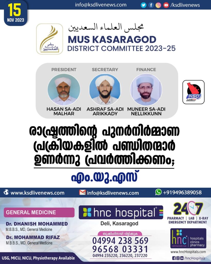 ഭാരവാഹികളായി ഹസൻ സഅദി മള്ഹർ (പ്രസിഡന്റ്) സയ്യിദ് യാസീൻ സഅദി അൽബുഖാരി ബായാർ അബൂബക്കർ സഅദി നെക്ക്രാജെ ഇസ്മാഈൽ സഅദി എം.ടി.പി തൃക്കരിപ്പൂർ അബ്ദുൽ റഹ്മാൻ സഅദി പുഞ്ചാവി (വൈസ്) അഷ്റഫ് സഅദി ആരിക്കാടി