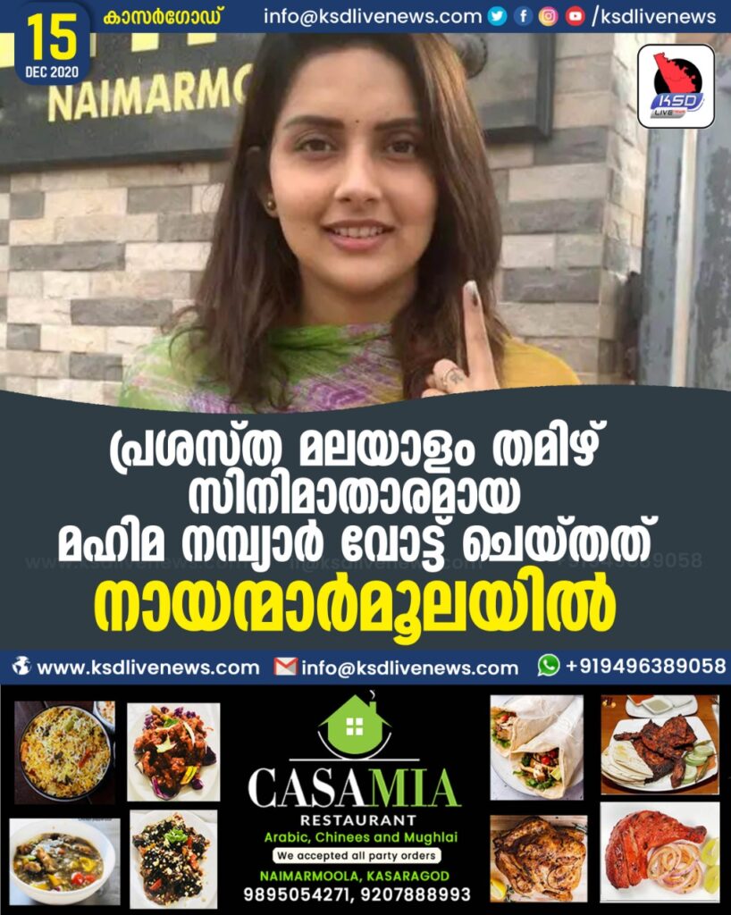 കാസർഗോഡ് • പ്രശസ്ത മലയാളം തമിഴ് സിനിമാതാരമായ മഹിമ നമ്ബ്യാര്‍ നായന്മാര്‍മൂല എല്‍. പി. സ്‌കൂളില്‍ വോട്ട് രേഖപ്പെടുത്തി. രാവിലെ 7.15 ഓടെ മാതാപിക്കള്‍ക്കും സഹോദരനും ഒപ്പം എത്തിയാണ് വോട്ട് രേഖപ്പെടുത്തിയത്. ഹൈദരാബാദില്‍ മലയാള സിനിമയുടെ ലൊക്കേഷനില്‍ ആയിരുന്ന താരം വോട്ടു രേഖപ്പെടുത്തുന്നതിന് വേണ്ടിയാണ് നാട്ടില്‍ എത്തിയത്.