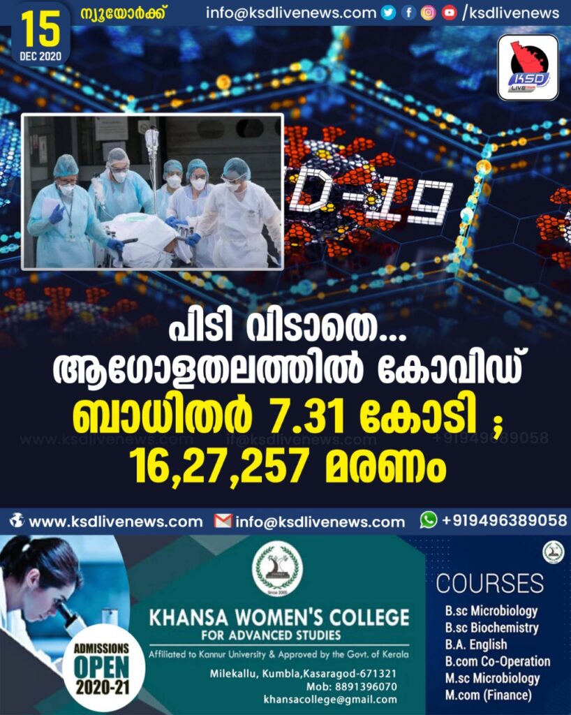ആഗോളതലത്തിൽ കോവിഡ് ബാധിതർ 7.31 കോടി ; 16,27,257 മരണം