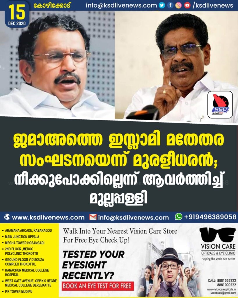 ജമാഅത്തെ ഇസ്ലാമി മതേതര സംഘടനയെന്ന് മുരളീധരന്‍; നീക്കുപോക്കില്ലെന്ന് ആവര്‍ത്തിച്ച് മുല്ലപ്പള്ളി