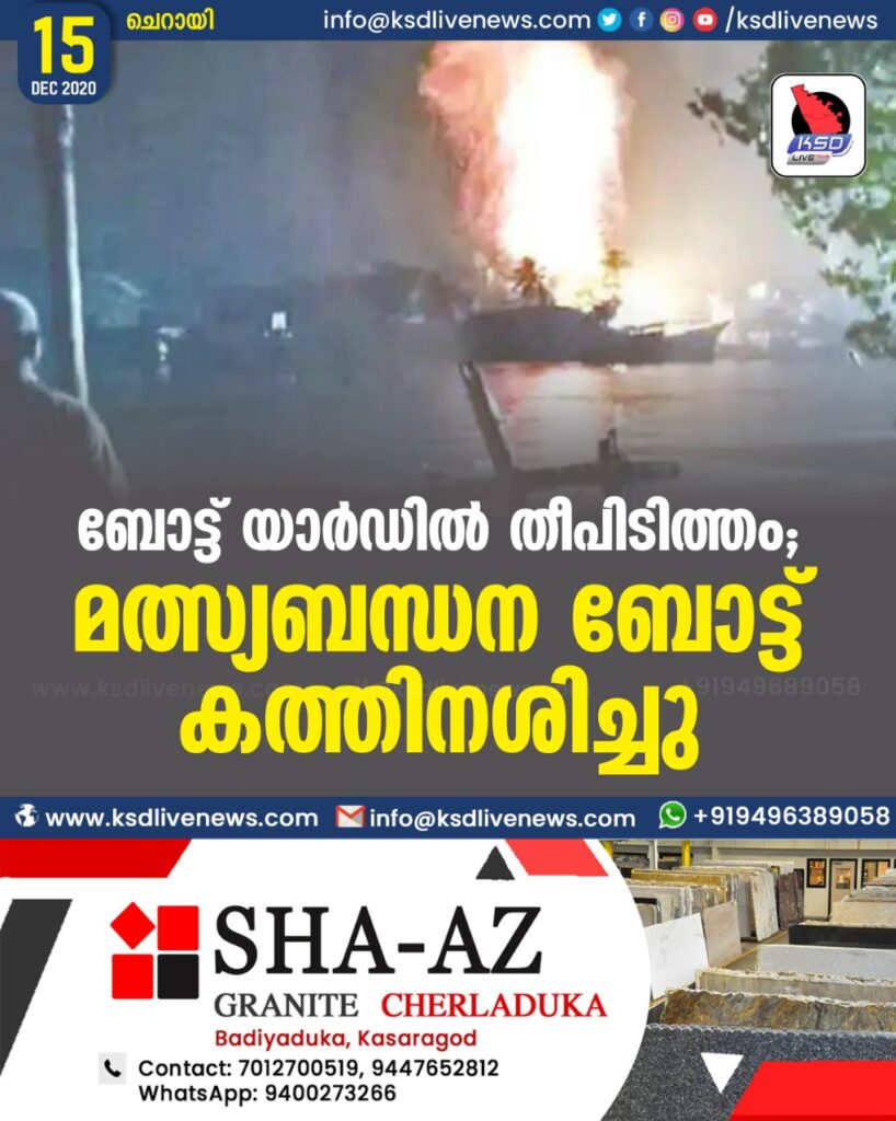 അജിബ്രോസ് എന്നയാളുടെ യാര്ഡിലാണ് തീപിടിത്തമുണ്ടായത്. “ഹോളി ഗ്രേസ്’ എന്ന മത്സ്യബന്ധന ബോട്ടാണ് കത്തി നശിച്ചത് .