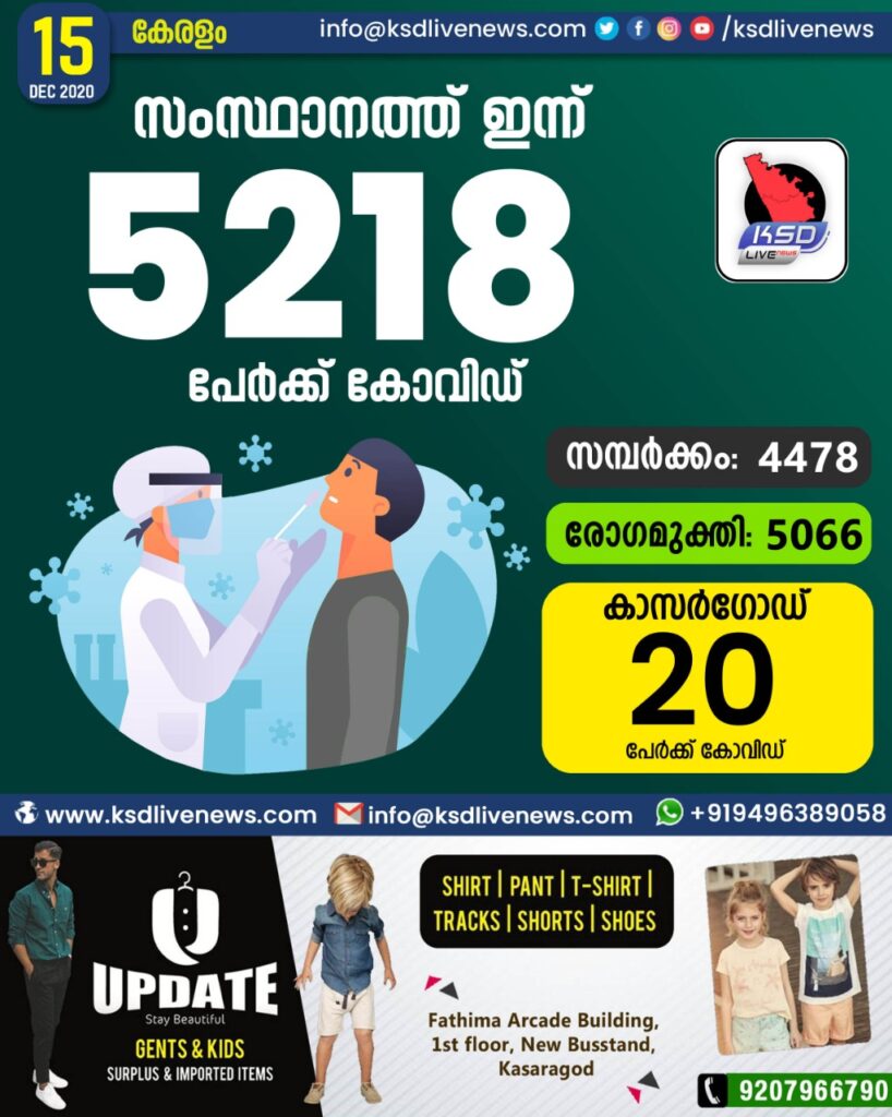 സംസ്ഥാനത്ത് ഇന്ന് 5218 പേർക്ക് കോവിഡ് സ്ഥിരീകരിച്ചു. സമ്പർക്കം വഴി 4478 പേർക്കും ; ആശ്വാസമായി 5066 പേർക്ക് രോഗ മുക്തിയും ; കാസർഗോഡ് ജില്ലയിൽ 20 പേർക്ക് പുതിയ കോവിഡ് കേസുകൾ ; മരണം 33