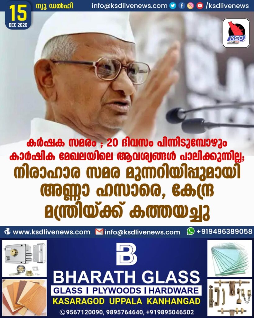 കർഷക സമരം ; 20 ദിവസം പിന്നിടുമ്പോഴും കാർഷിക മേഖലയിലെ ആവശ്യങ്ങൾ പാലിക്കുന്നില്ല ; നിരാഹാര സമര മുന്നറിയിപ്പുമായി അണ്ണാ ഹസാരെ , കേന്ദ്ര മന്ത്രിയ്ക്ക് കത്തയച്ചു