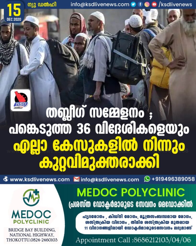 തബ്ലീഗ് സമ്മേളനം ; പങ്കെടുത്ത 36 വിദേശികളെയും എല്ലാ കേസുകളിൽ നിന്നും കുറ്റവിമുക്തരാക്കി