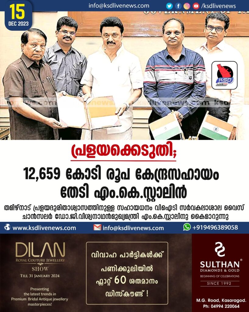 ചെന്നൈ: പ്രളയ ദുരിതാശ്വാസ പ്രവർത്തനങ്ങളും ദുരിത മേഖലകളിൽ പുനരധിവാസ പ്രവർത്തനങ്ങൾ നടത്തുന്നതിനുമായി സംസ്ഥാനത്തിന് 12,659 കോടി രൂപയുടെ സാമ്പത്തിക സഹായം തേടി മുഖ്യമന്ത്രി എം.കെ.സ്റ്റാലിൻ കേന്ദ്ര സംഘത്തിനു നിവേദനം നൽകി.
