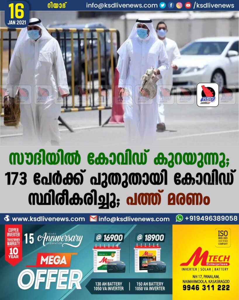 സൗദിയിൽ കോവിഡ് കുറയുന്നു; 173 പേർക്ക് പുതുതായി കോവിഡ് സ്ഥിരീകരിച്ചു; പത്ത് മരണം
