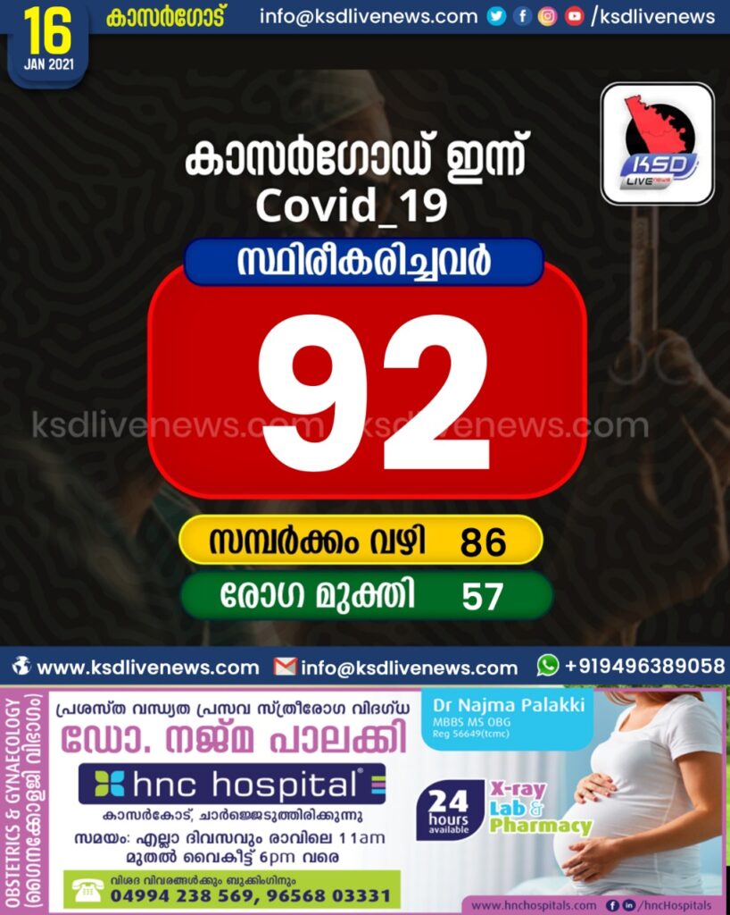 കാസർഗോഡ് ജില്ലയിൽ ഇന്ന് 92 പേർക്ക് കോവിഡ് സ്ഥിരീകരിച്ചു. സമ്പർക്കം വഴി 86 പേർക്കും. 57 പേർക്ക് രോഗമുക്തി