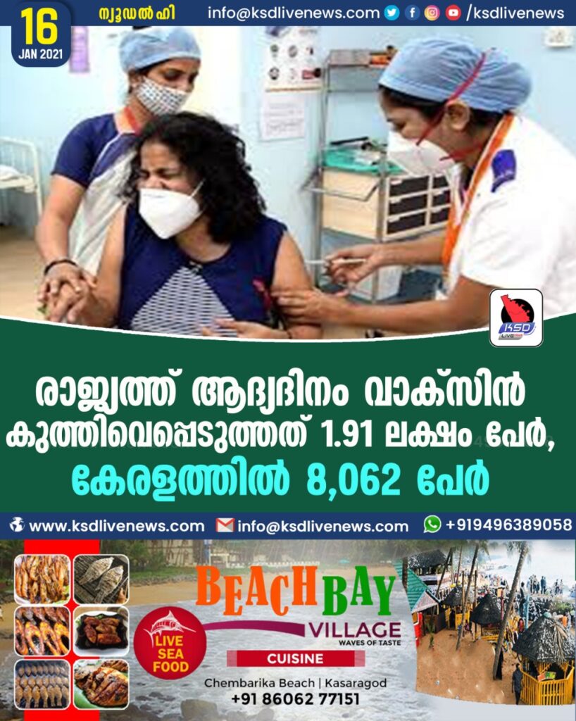 രാജ്യത്ത് ആദ്യദിനം വാക്സിന് കുത്തിവെപ്പെടുത്തത് 1.91 ലക്ഷം പേര്, കേരളത്തില് 8,062 പേര്