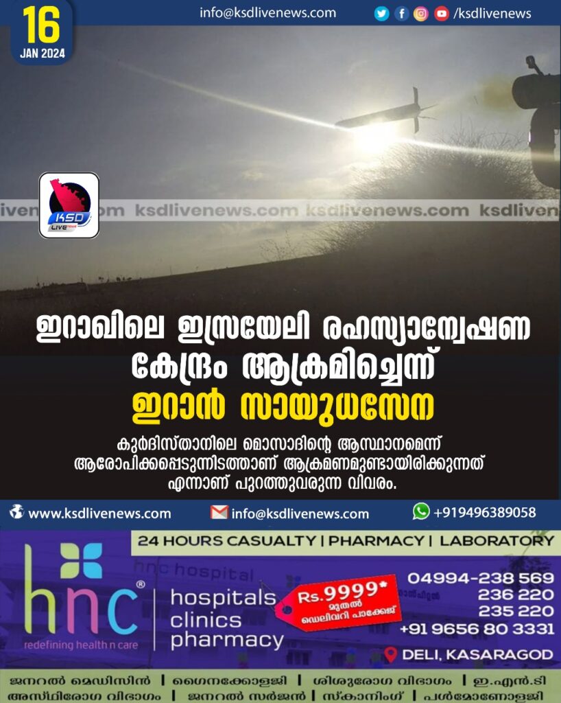 ടെഹ്റാന് (ഇറാന്): ഇറാഖിന്റെ സ്വയംഭരണ പ്രദേശമായ കുര്ദിസ്താന് മേഖലയിലെ രഹസ്യാന്വേഷണകേന്ദ്രം ആക്രമിച്ചതായി ഇറാന് സായുധസേനയുടെ ഭാഗമായ ഇസ്ലാമിക് റെവല്യൂഷണറി ഗാര്ഡ് കോപ്സ്. ആക്രമണത്തിന്റെ ഉത്തരവാദിത്വം ഏറ്റെടുത്തുകൊണ്ട് റെവല്യൂഷണറി ഗാര്ഡ് കോപ്സിന്റെ പ്രസ്താവന പുറത്തുവന്നു.