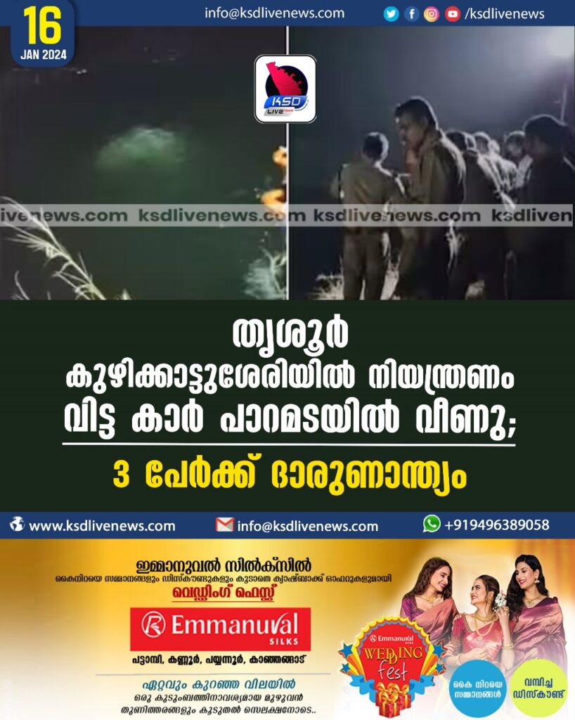തൃശൂർ കുഴിക്കാട്ടുശേരിയിൽ നിയന്ത്രണം വിട്ട കാർ പാറമടയിൽ വീണു; 3 പേർക്ക് ദാരുണാന്ത്യം