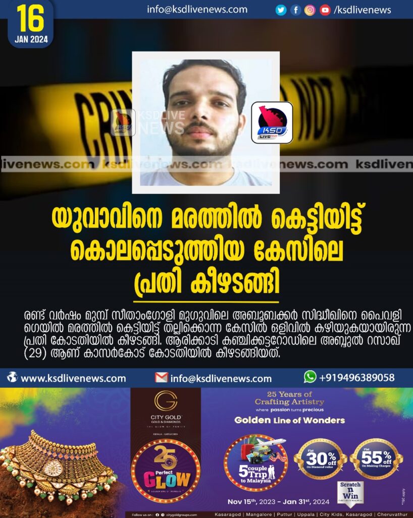 മഞ്ചേശ്വരം: രണ്ട് വര്ഷം മുമ്പ് സീതാംഗോളി മുഗുവിലെ അബൂബക്കര് സിദ്ധീഖിനെ പൈവളിഗെയില് മരത്തില് കെട്ടിയിട്ട് തല്ലിക്കൊന്ന കേസില് ഒളിവില് കഴിയുകയായിരുന്ന പ്രതി കോടതിയില് കീഴടങ്ങി. ആരിക്കാടി കഞ്ചിക്കട്ട റോഡിലെ അബ്ദുല് റസാഖ് (29) ആണ് കാസര്കോട് കോടതിയില് കീഴടങ്ങിയത്. പ്രതിയെ കൂടുതല് ചോദ്യം ചെയ്യുന്നതിനായി മഞ്ചേശ്വരം പൊലീസ് കസ്റ്റഡിയിലെടുത്തു. സ്വര്ണ്ണക്കടത്ത് സംബന്ധമായ തര്ക്കത്തെ തുടര്ന്നാണ് അബൂബക്കര് സിദ്ധീഖിനെ 11 അംഗ സംഘം പൈവളിഗയിലേക്ക് വിളിച്ച് വരുത്തി മരത്തില് തല കീഴായി കെട്ടിയിട്ട് ക്രൂരമായി തല്ലി കൊലപ്പെടുത്തിയെന്നാണ് കേസ്.