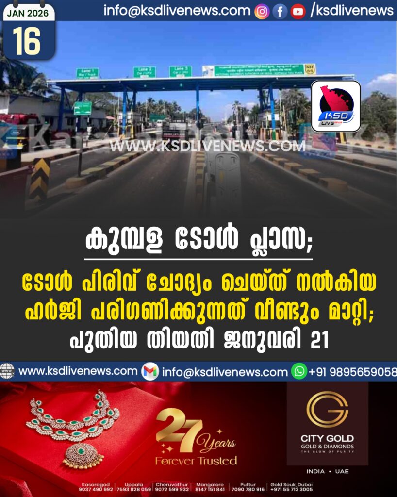 കുമ്പള ടോള് പ്ലാസ: ടോള് പിരിവ് ചോദ്യം ചെയ്ത് നല്കിയ ഹര്ജി പരിഗണിക്കുന്നത് വീണ്ടും മാറ്റി; പുതിയ തിയതി ജനുവരി 21