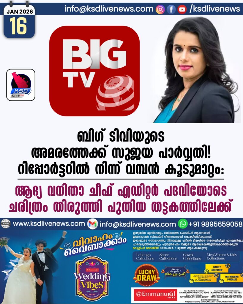 ബിഗ് ടിവിയുടെ അമരത്തേക്ക് സുജയ പാര്വ്വതി! റിപ്പോര്ട്ടറില് നിന്ന് വമ്പന് കൂടുമാറ്റം; ആദ്യ വനിതാ ചീഫ് എഡിറ്റര് പദവിയോടെ ചരിത്രം തിരുത്തി പുതിയ തട്ടകത്തിലേക്ക്
