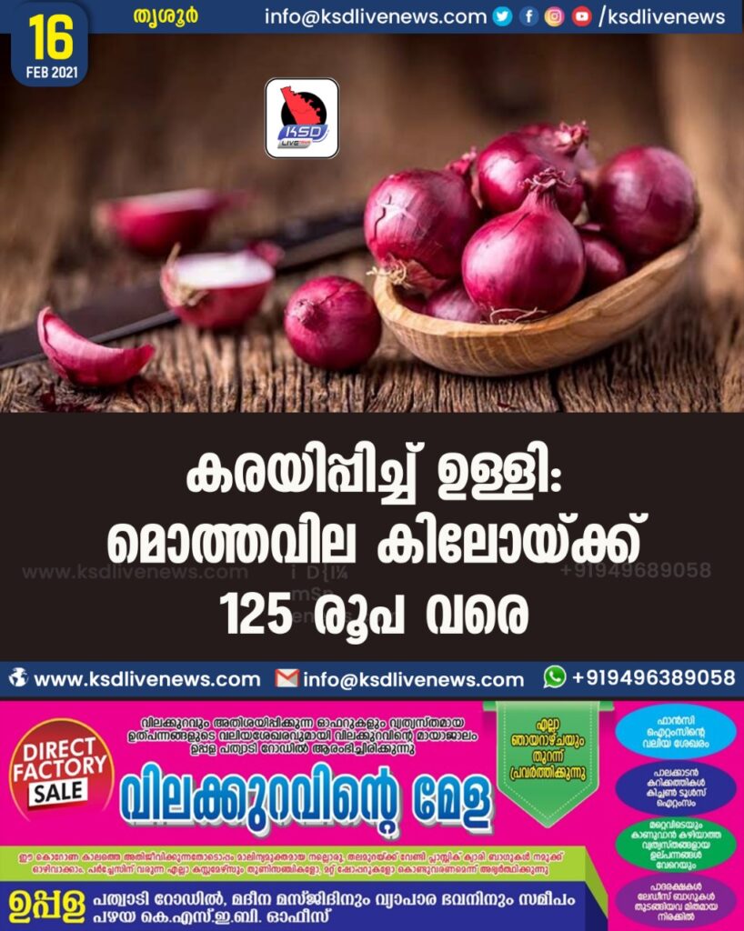 തൃശ്ശൂർ: ഉള്ളിയുടെ മൊത്തവില കിലോയ്ക്ക് 125 രൂപ വരെ ഉയർന്നു. രണ്ടാഴ്ചയ്ക്കിടെയാണ് ഇത്രയും വർധന. ഏതാനും ദിവസങ്ങൾ കൂടി വില ഉയർന്നു തന്നെ തുടരാനാണ് സാധ്യതയെന്നാണ് വ്യാപാരികൾ പറയുന്നത്.