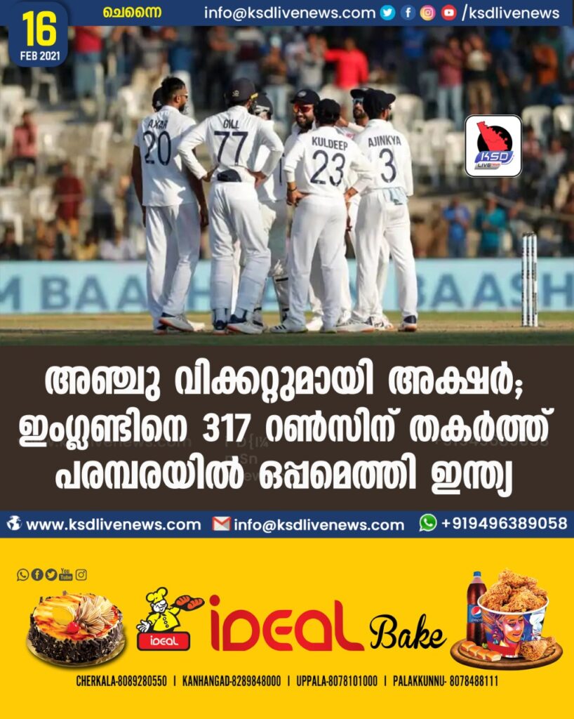 അഞ്ചു വിക്കറ്റുമായി അക്ഷര്‍; ഇംഗ്ലണ്ടിനെ 317 റണ്‍സിന് തകര്‍ത്ത് പരമ്പരയില്‍ ഒപ്പമെത്തി ഇന്ത്യ