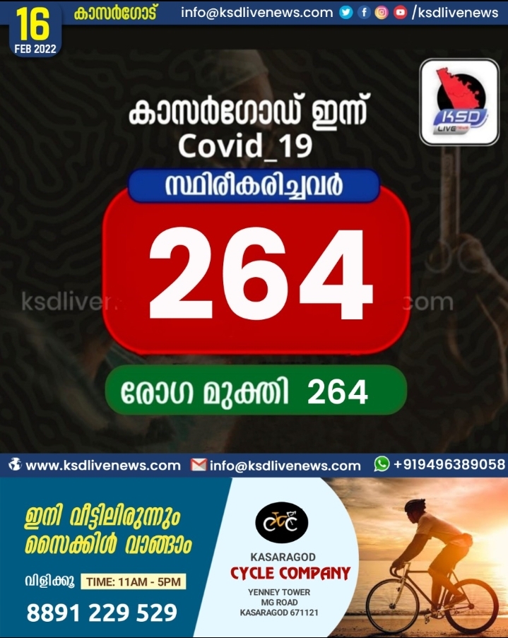 കാസര്കോട് ജില്ലയിൽ പേർ 264കൂടി കോവിഡ്-19 പോസിറ്റീവായി. ചികിത്സയിലുണ്ടായിരുന്ന 308