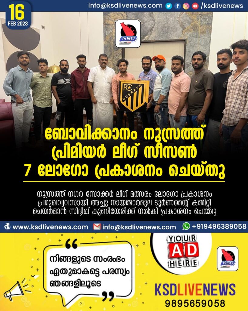 ബോവിക്കാനം നുസ്രത്ത് പ്രിമിയർ ലീഗ് സീസൺ 7 ലോഗോ പ്രകാശനം ചെയ്തുSHARE THIS ONനുസ്രത്ത് നഗർ സോക്കർ ലീഗ് മത്സരം ലോഗോ പ്രകാശനം പ്രമുഖ വ്യവസായി അച്ചു നായമ്മാർമുല ടൂർണമെന്റ് കമ്മിറ്റി ചെയർമാൻ സിദ്ദിഖ് കുണിയേരിക്ക് നൽകി പ്രകാശനം ചെയ്തു