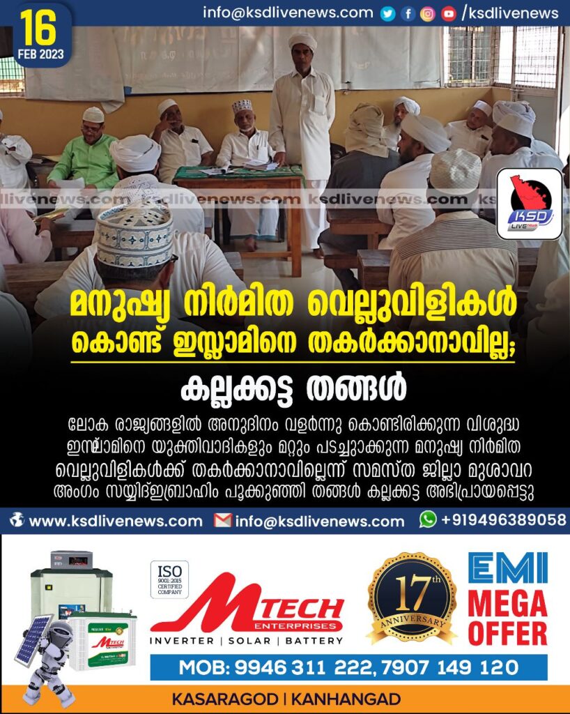 ചെങ്കള : ലോക രാജ്യങ്ങളിൽ അനുദിനം വളർന്നു കൊണ്ടിരിക്കുന്ന വിശുദ്ധ ഇസ്‌ലാമിനെ യുക്തിവാദികളും മറ്റും പടച്ചുണ്ടാക്കുന്ന മനുഷ്യ നിർമിത വെല്ലുവിളികൾക്ക് തകർക്കാനാവില്ലെന്ന് സമസ്ത ജില്ലാ മുശാവറ അംഗം സയ്യിദ്‌ ഇബ്രാഹിം പൂക്കുഞ്ഞി തങ്ങൾ കല്ലക്കട്ട അഭിപ്രായപ്പെട്ടു.