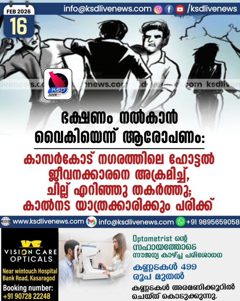 ഭക്ഷണം നല്കാന് വൈകിയെന്ന് ആരോപണം: കാസർകോട് നഗരത്തിലെ ഹോട്ടല് ജീവനക്കാരനെ അക്രമിച്ച്, ചില്ല് എറിഞ്ഞു തകര്ത്തു; കാല്നട യാത്രക്കാരിക്കും പരിക്ക്