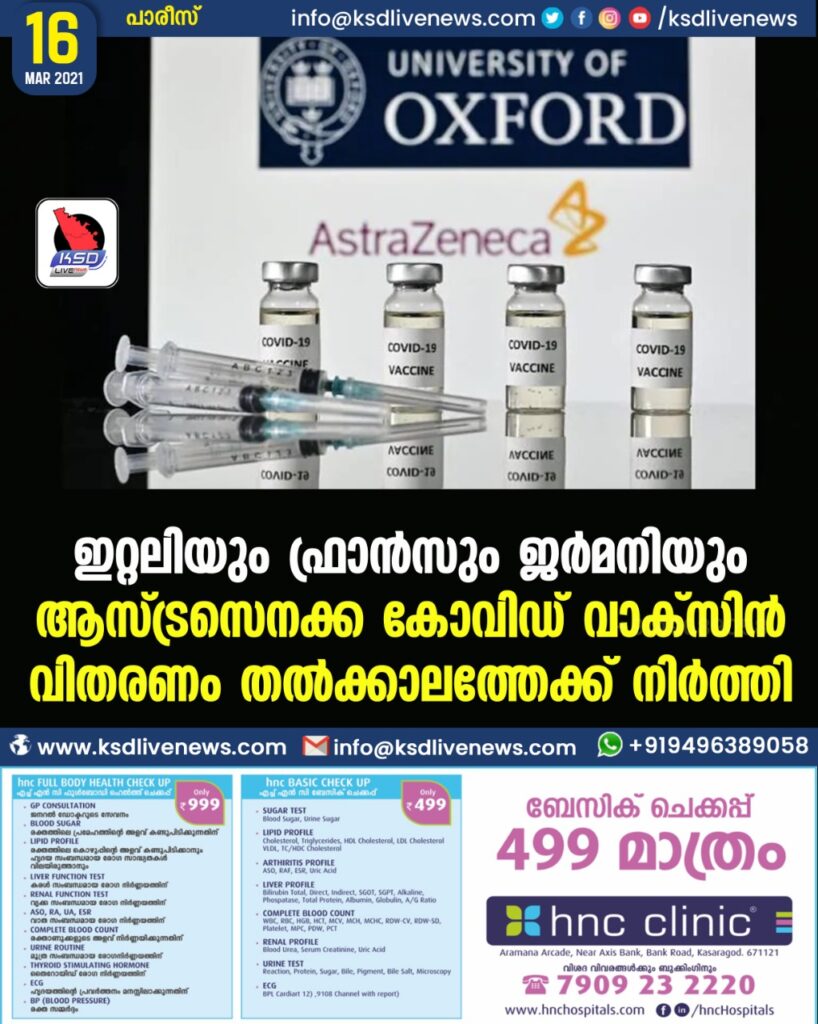 ഇറ്റലിയും ഫ്രാന്സും ജര്മനിയും ആസ്ട്രസെനക്ക കോവിഡ് വാക്സിന് വിതരണം തല്ക്കാലത്തേക്ക് നിര്ത്തി