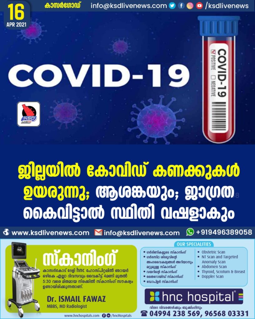 കാഞ്ഞങ്ങാട് ∙ ജില്ലയിൽ കോവിഡ് പോസിറ്റീവാകുന്നവരുടെ പ്രതിദിന എണ്ണം 500 കടക്കുമെന്ന കണക്കൂട്ടലിൽ ആരോഗ്യ വകുപ്പ്. വിഷു അവധിയായതിനാൽ കഴിഞ്ഞ ദിവസം വ്യാപകമായി സ്രവ പരിശോധന നടത്തിയിരുന്നില്ല. വരും ദിവസങ്ങളിൽ സ്രവ പരിശോധന കൂടുന്നതോടെ കോവിഡ് പോസിറ്റീവാകുന്നവരുടെ എണ്ണവും ഉയരുമെന്നാണ് ആരോഗ്യ വകുപ്പിന്റെ കണക്കു കൂട്ടൽ.    കോവിഡ് സ്ഥിരീകരിക്കുന്നവരുടെ എണ്ണം പരിധി വിട്ടാൽ ആശങ്ക ഏറെയാണ്. മതിയായ ചികിത്സാ സൗകര്യമില്ലാത്തതാണ് ആശങ്കയ്ക്ക് പ്രധാന കാരണം.